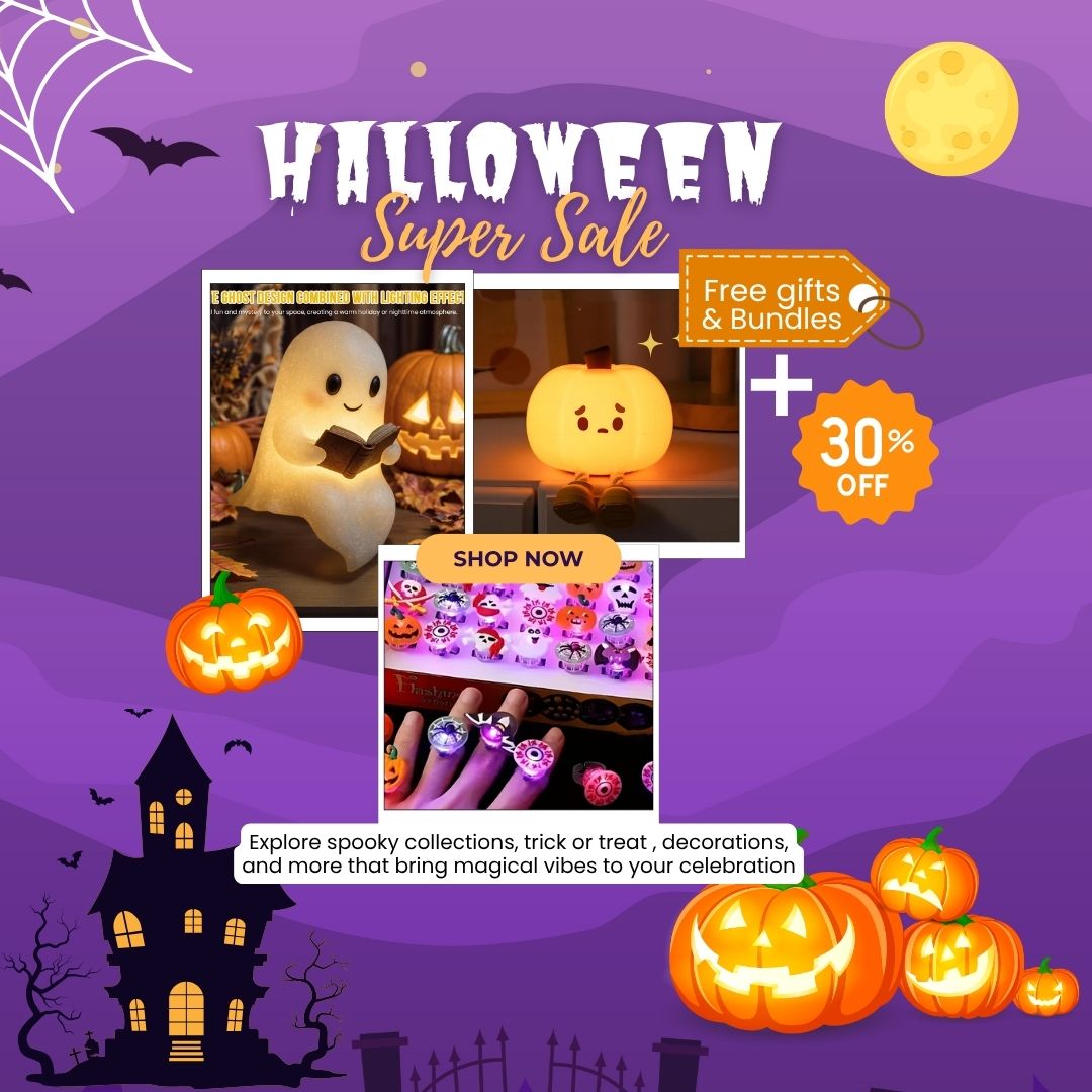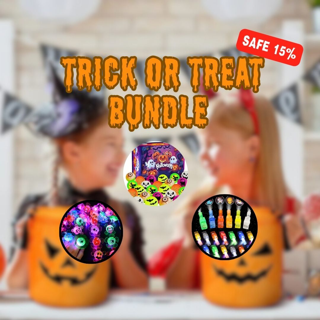 Each 50-piece set includes a mix of glowing designs like pumpkins, ghosts, skulls, bats, spiders, and eyeballs — perfect for kids’ parties, trick-or-treating, and festive celebrations.